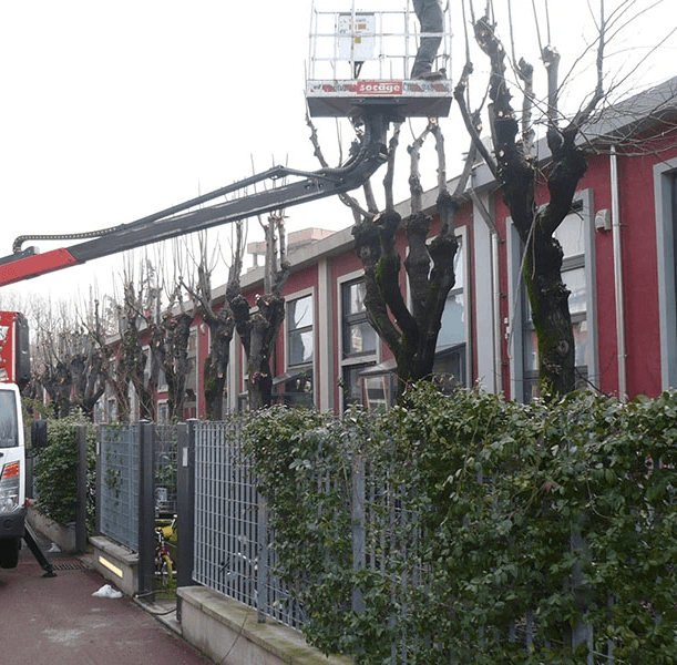 Potatura di alberi alto fusto e grandi siepi con piattaforma. Rispetto fisiologia pianta + sicurezza operatore.